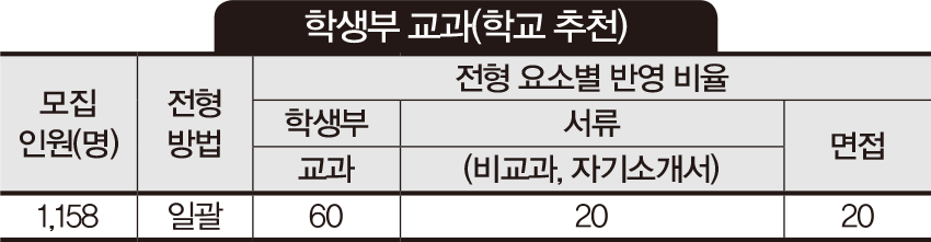 전형 방법이 단계별 전형에서 일괄 전형으로 변경됐다. 학생부 교과 60%, 서류 20%, 면접 20%를 반영해 최종 합격자를 선발한다. 학교에서 추천받아 지원하는 모든 학생에게 면접의 기회가 주어진다. 반영 비율상으로는 교과의 영향력이 높아졌다. 학생부 교과 성적은 원점수, 평균, 표준편차, 석차등급이 기재된 모든 교과의 석차등급을 반영하고 1학년 20%, 2학년 40%, 3학년 40%로 학년별 반영 비율을 적용한다. 1등급에서 3등급까지 등급 간 점수 차를 1.2점씩 두었으나 4등급 이하부터 점수 차가 크게 벌어진다. 내신 성적이 좋은 학생들이 추천을 받기 때문에 최상위권 학생들만 지원하고 합격할 것으로 예상된다. 서류는 학생부(비교과)와 자기소개서를 종합적으로 평가한다.
