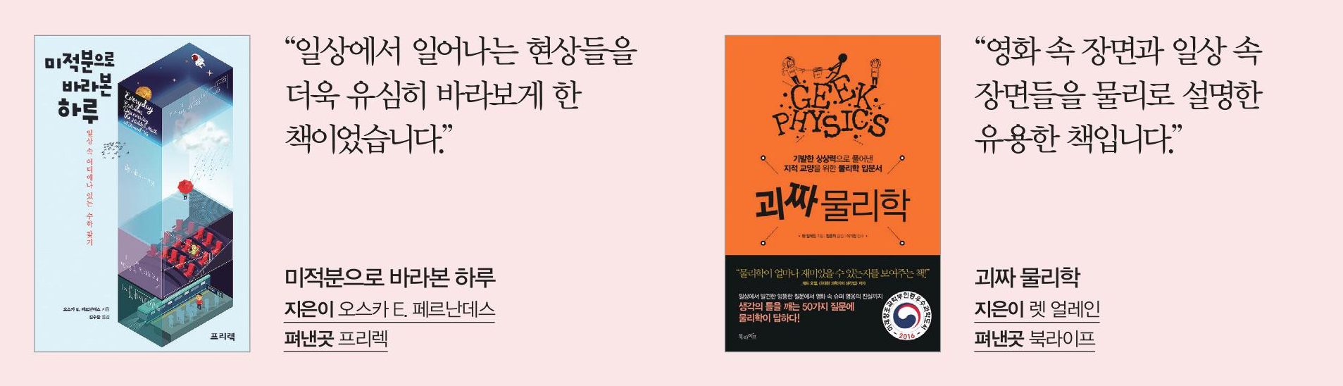 <괴짜 물리학>은 <어벤져스> <스타워즈> 등 영화 속 한 장면을 해석해서 과학적으로 ‘오류가 있다’ 혹은 ‘가능하다’로 분석한 책인데요. 스쳐지나가는 순간도 물리로 설명할 수 있다고 느끼게 해준, 재밌고 유용한 책입니다.