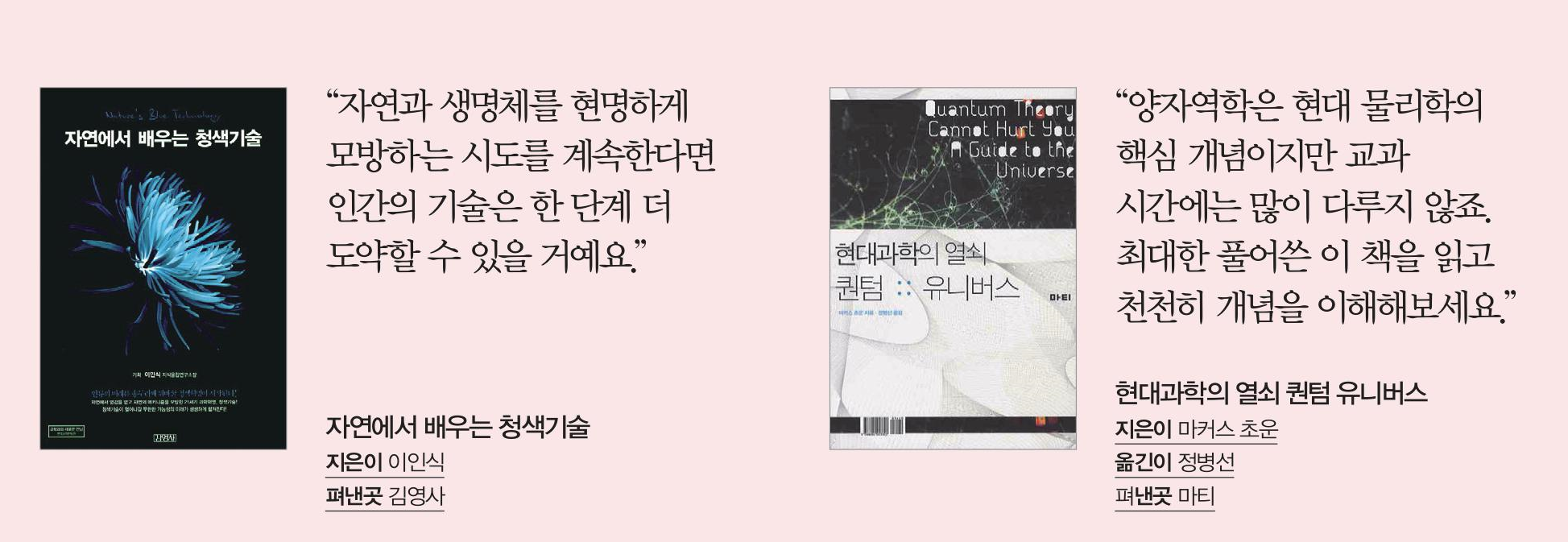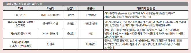 그래서 현대 물리학의 핵심인 양자역학을 다룬 <현대과학의 열쇠 퀀텀 유니버스>를 추천해요. 현대 물리에 입문하고 이를 통해 재료공학부에서는 무엇을 공부하는지 생각할 수 있는 기회를 이 책이 제공하리라 생각해요. 개념 자체가 어렵다보니 이 책의 모든 내용을 단번에 이해하기는 어렵겠지만, 중·고등학생의 눈높이에서 최대한 부드럽게 서술돼 천천히 읽으며 생각을 거듭해보는 걸 추천해요.