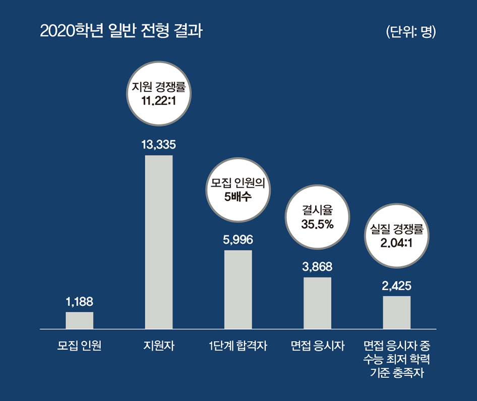 학생부 종합 일반 전형-학업 우수형은 전년 일반 전형과 흡사하다. 1단계에서 서류 평가(학생부, 자기소개서)를 통해 모집 단위별 모집 인원의 5배수 내외로 2단계 면접 대상자를 선발한다. 2단계에서는 1단계 성적 70%와 면접 30%를 반영해 최종 합격자를 선발한다. 수능 최저 학력 기준은 전년 일반 전형에 비해 4개 영역 기준 1등급씩 완화됐다고는 하지만, 탐구 1개 과목만 반영했던 것과 달리 탐구 2개 과목을 반영하기 때문에 여전히 충족하기가 만만치 않다.