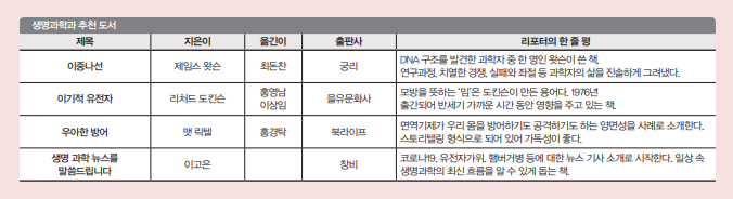 A <과학자가 되는 방법>이요. 생명과학은 재미있지만, 과학자로서의 삶은 녹록지 않을 수 있습니다. 공부할 것이 많고, 학사-석·박사-박사 후 과정까지 여러 단계를 거쳐야 합니다. 이 책은 과학자가 되는 과정 중에 있는 크고 작은 난관들을 소개하고 향후 어떤 직업을 가질 수 있는지도 알려줍니다. 모호했던 과학자라는 꿈의 뼈대를 세우는 데 큰 도움이 됐습니다.