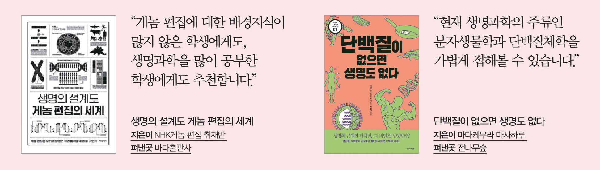 A <단백질이 없으면 생명도 없다>를 추천합니다. <생명과학> 교과서에서는 단백질에 대해 구조와 소화 과정 위주로 다뤄요. 단백질이 구체적으로 작동하는 사례는 알려주지 않아 아쉬웠습니다.