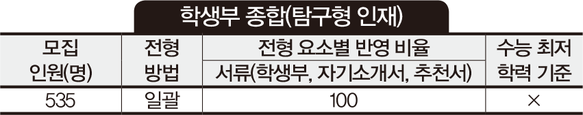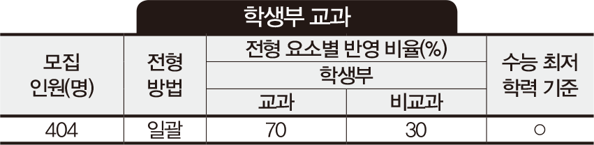 학생부 100% 전형으로 교과 70%와 비교과 30%를 반영하며, 최저 기준을 적용한다. 학생부 교과 성적은 인문 계열은 국어, 수학, 영어, 사회 교과의 전 과목을, 자연 계열은 국어, 수학, 영어, 과학 교과의 전 과목을 반영한다. 교차 지원도 물론 가능하다. 예로 인문 계열 학생이 자연 계열로 지원할 경우, 2~3학년 이수 과목에 과학 교과가 없더라도 1학년 때 이수한 과학 교과목을 반영해 교과 성적을 산출한다. 단, 수능 영역은 희망 계열로 응시해 충족해야 한다. 최저 기준에서 인문 계열은 탐구 2과목 평균, 자연 계열은 과탐 1과목만 반영한다.