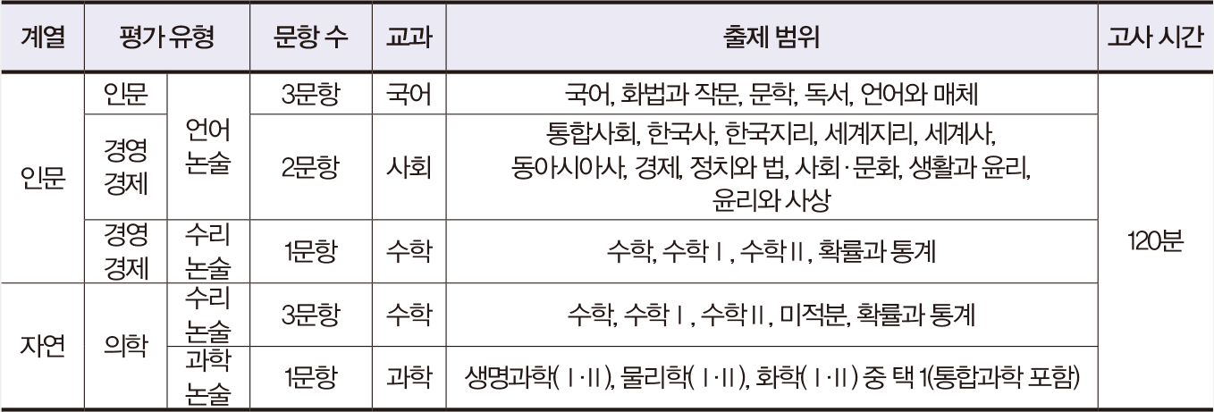논술 고사 시간은 120분이고, 고교 교육과정 내에서 출제한다. 인문 계열은 통합형, 자연 계열은 단일 교과형(수학, 과학)으로 출제된다. 특히 자연 계열의 경우 원서 접수 시 선택한 과학 과목을 응시해야 한다. 과학 논술은 선택 과목의 Ⅰ·Ⅱ가 출제 범위이며, 최저 기준을 충족할 수 있다면 도전해볼 만하다.