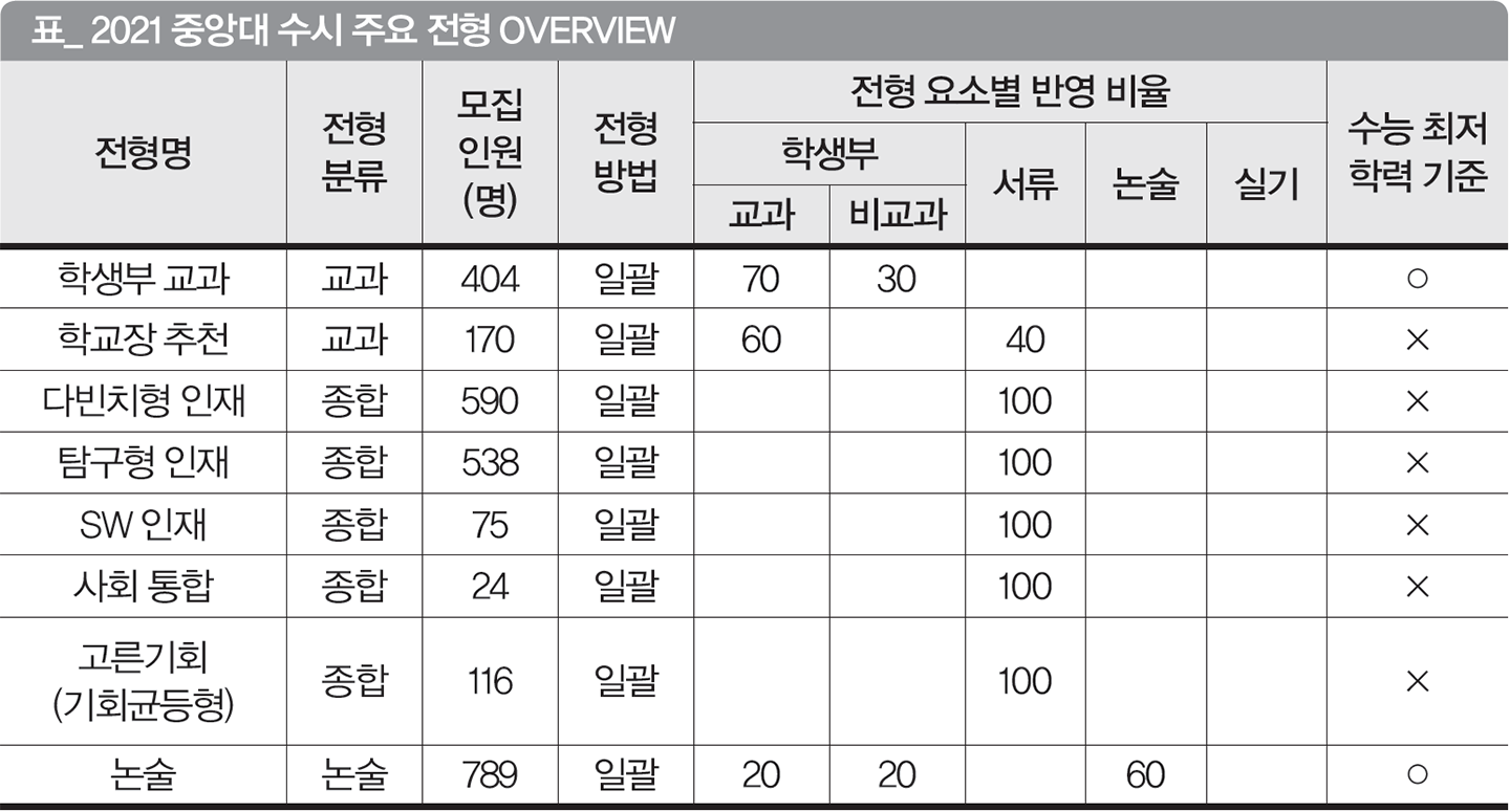 (표) 2021 중앙대 수시 주요 전형 OVERVIEW