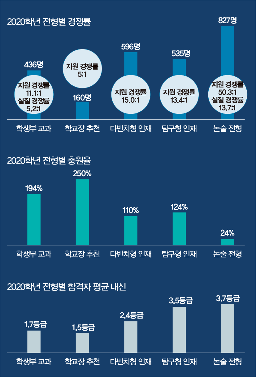 최저 기준을 어떤 수준으로 바꾸든 최저 기준 충족 비율은 비슷하다. 2020학년 학생부 교과는 436명 모집에 4천829명이 지원해 11.1:1의 경쟁률을 기록했다. 2019학년 10.5:1보다 소폭 상승했다. 최저 기준을 2020학년에 완화한 결과 최저 기준을 충족한 학생들의 실질 경쟁률은 2019학년 3.8:1에서 5.2:1로 상승했다. 종합 전형에서 2020학년에 면접을 폐지했던 이유는 1단계 서류에서 합격해도 면접을 응시하지 않는 경우가 많았고, 합격권의 미등록 비율도 높아 면접의 실효성이 높지 않다고 판단했기 때문이었다. 실제 면접을 폐지했을 때 지원자 풀이 달라졌다거나 지원 패턴의 변화는 느낄 수 없었다. 2020학년 탐구형 인재 경쟁률은 13.4:1로 전년 경쟁률 12.0:1보다 상승했고, 다빈치형 인재는 15.0:1로 전년 경쟁률 16.2:1보다 다소 하락했다.
