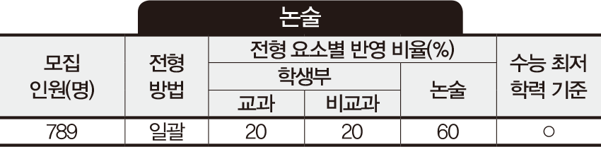 논술 전형은 교과 20%, 비교과 20%, 논술 60%를 반영하며 최저 기준을 적용한다. 교과 성적은 인문 계열은 국어, 수학, 영어, 사회 중 상위 10개 과목을, 자연 계열은 국어, 수학, 영어, 과학 중 상위 10개 과목을 반영한다.