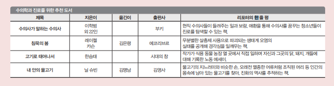 수의사가 실제로 어떤 일을 하는지 궁금한 학생들은 꼭 읽어보세요. <동물 해방>도 추천하고 싶어요. 동물 복지나 동물 윤리에 대한 관심이 높아지면서 동물 실험에 대한 찬반토론도 많아지고 있어요. 책을 지은 피터 싱어는 공리주의자인데, ‘최대 다수의 최대 행복’이라는 공리주의 이념에 근거해 동물 실험, 동물 학대, 사육 환경 개선을 얘기하는 부분이 신선했고 공감이 됐어요.
