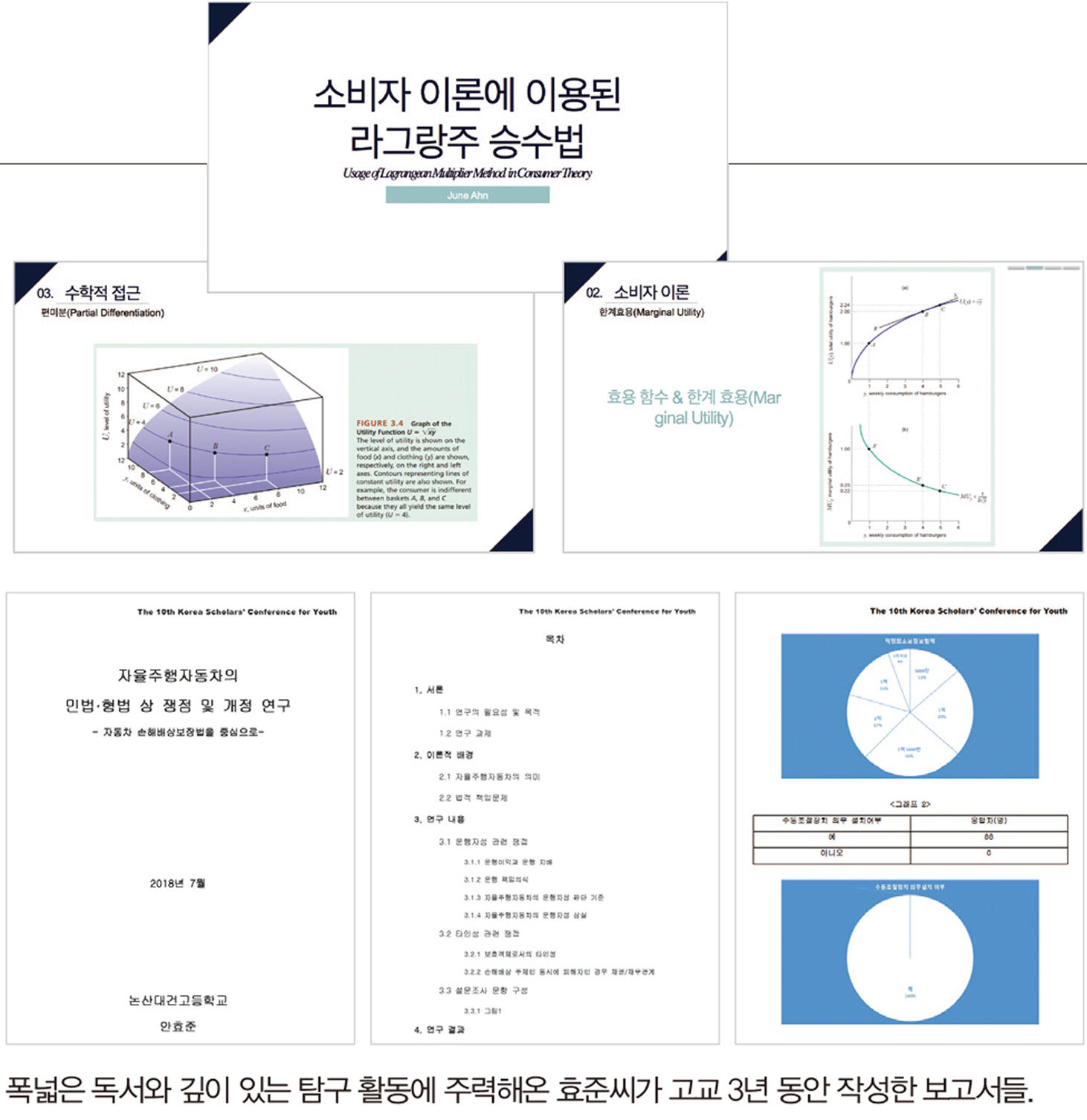 효준씨가 고교 3년 동안 해온 탐구 활동의 시작은 교과서였다. 분야에 상관없이 교과 수업에서 배운 내용을 바탕으로 심화 개념과 응용 사례를 탐구하며 새로운 분야에 대한 지식을 넓혀갔다.