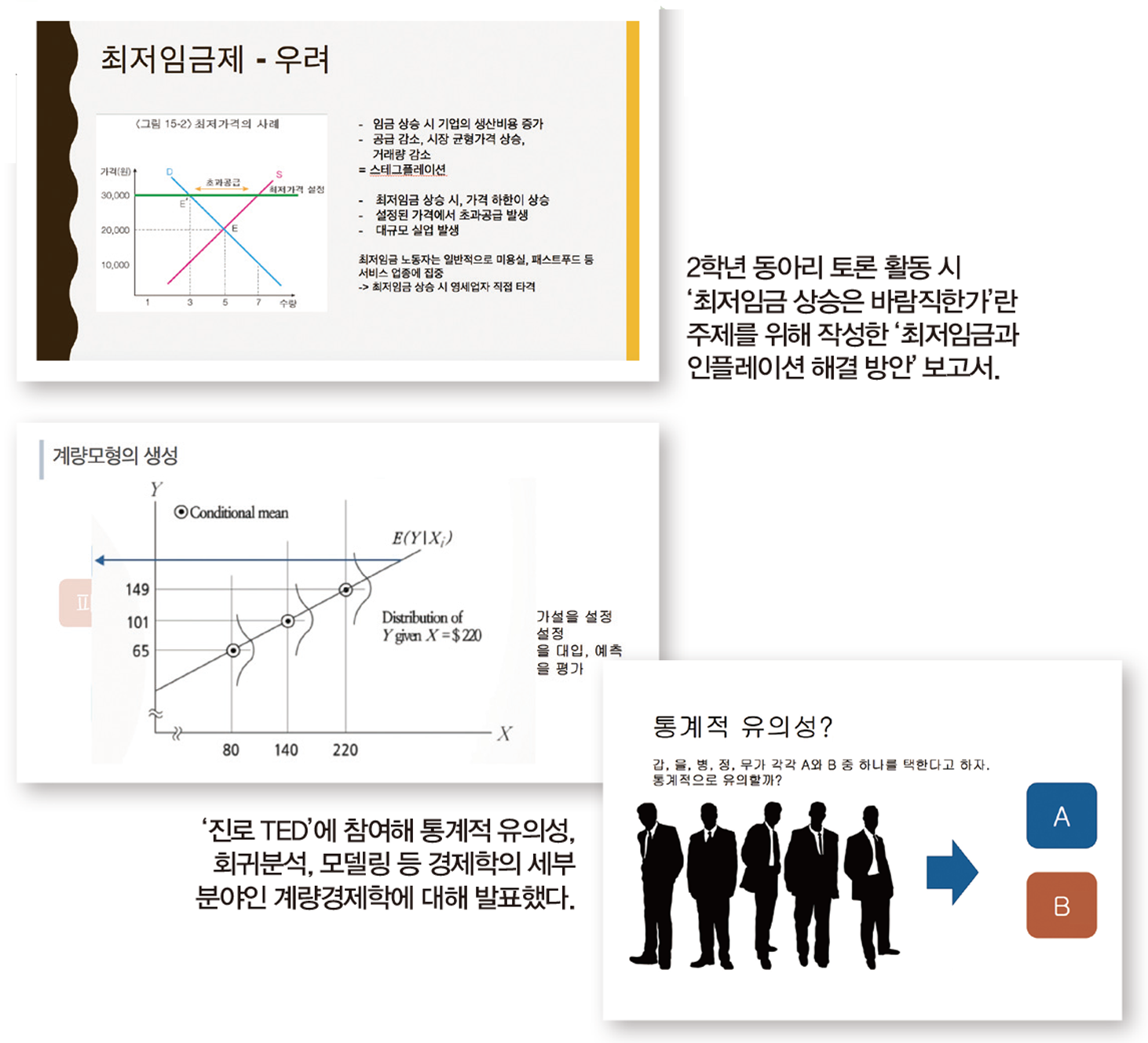 ‘계량경제학’을 주제로 한 K-MOOC 강의를 수강하고 보고서 작성·발표. <4차 산업혁명 시대의 공유경제>라는 책을 읽고 ‘공유경제의 가능성과 불안 요소, 그리고 그에 따른 전망은 어떠한가?’라는 논제에 관해 3인 1조의 팀을 구성해 교내 토론제 참가. 경영 동아리 부단장으로서 경제 모의고사 풀이, 멘토링, ‘최저임금 상승은 바람직한가’에 대한 토론 등을 계획하고 진행함