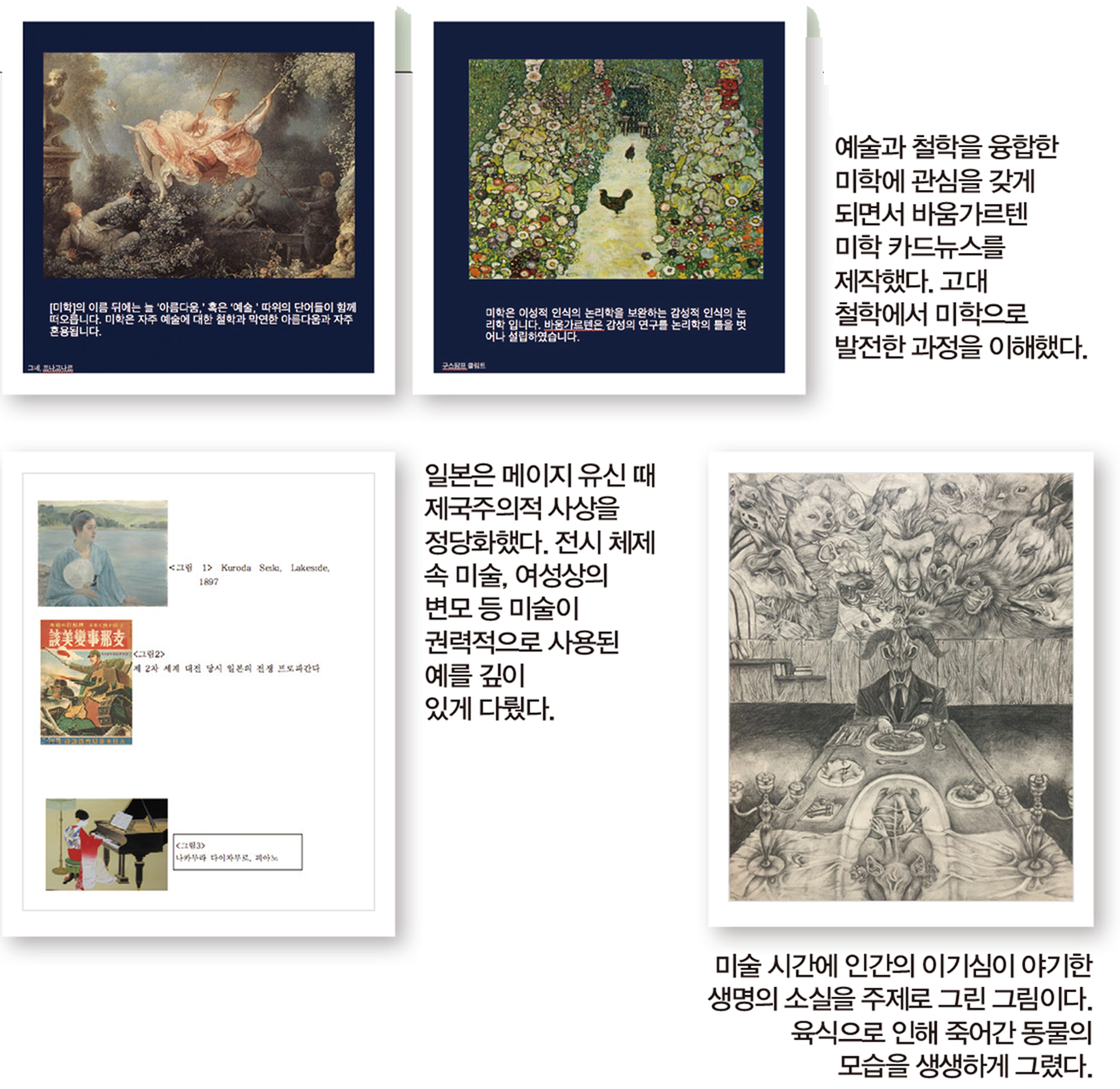 디자인에 대한 관심은 예술과 철학을 융합한 미학으로 이어졌다. 인식과 감각적 표출 양식의 학문을 미학이라고 정의했던 ‘바움가르텐’의 미학 세계를 카드뉴스로 제작해 고대 철학에서 미학으로 발전한 과정을 살폈다. 고1 때 선택한 <AP 세계사>를 배우면서는 역사, 정치철학에도 관심이 커졌다. AP란 미국의 고등학생들이 학교에서 대학 수준의 높은 교과 과정 수업을 듣고 시험 점수를 취득하는 과정이다. 미국 대학의 경우 AP 이수 상태를 중요하게 평가한다.