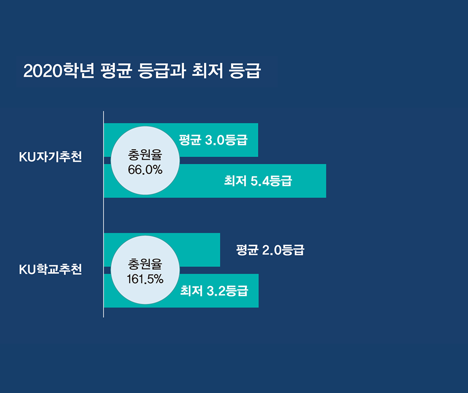 2020학년 KU학교추천 최종 합격자의 모집 단위별 교과 평균 등급은 인문 계열은 1.5(영어교육학과)~2.7(부동산학과)등급, 자연 계열은 1.1(수의예과)~2.8(식품유통공학과)등급으로 KU자기추천과 비교하면 상대적으로 높았다. 충원율 또한 161.5%로 KU자기추천보다 높았다.