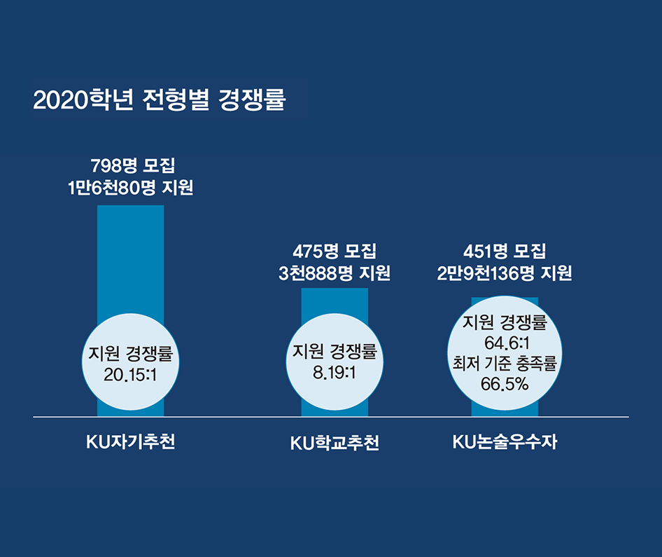 학령인구 감소에도 불구하고 KU자기추천의 경쟁률은 2018학년 18.29:1, 2019학년 20.11:1, 2020학년 20.15:1로 상승해 학생들의 선호도가 높음을 확인할 수 있었다. 서류 평가 시 학생부와 자기소개서의 모든 내용을 토대로 학업 역량, 전공 적합성, 인성, 발전 가능성을 A+, A, B+, B, C+, C, D 등 7등급으로 매겨 각 20%, 30%, 20%, 30%의 비율로 점수를 합산한다. 면접은 10분 내외의 서류 기반 면접으로 전공 적합성, 인성, 발전 가능성을 A+, A, B, C, D 등 5등급으로 매겨 각 30%, 20%, 50%의 비율로 평가한다.