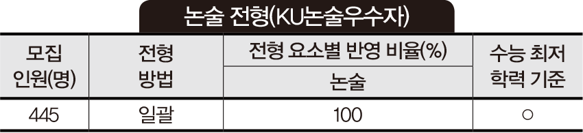 KU논술우수자 전형은 2020학년보다 6명 감소해 445명을 선발하며 오전(인문사회Ⅰ, 인문사회Ⅱ), 오후(자연 계열)로 나눠 논술 시험이 시행된다. 시험일은 인문, 자연 모두 수능 이후인 12월 5일(토)이며 시험 시간은 100분이다.