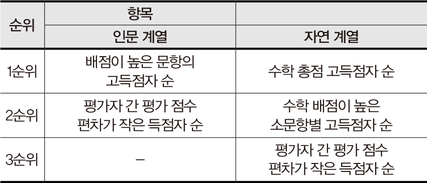 작년까지는 소문항별 배점이 같았지만, 올해 논술 고사에서는 자연 계열 논술의 수학 문항별 배점이 변경된다. 인문 계열은 400점으로 배점이 높은 1번 문항을, 자연 계열은 250점으로 배점이 높은 수학 2-2문항을 잘 보는 것이 중요하다.