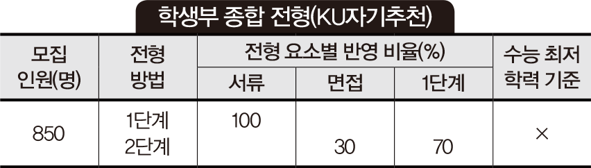 KU자기추천 전형은 1단계 서류 100%로 3배수를 선발한 뒤 2단계 면접 30%, 1단계 70%로 최종 합격자를 선발한다.