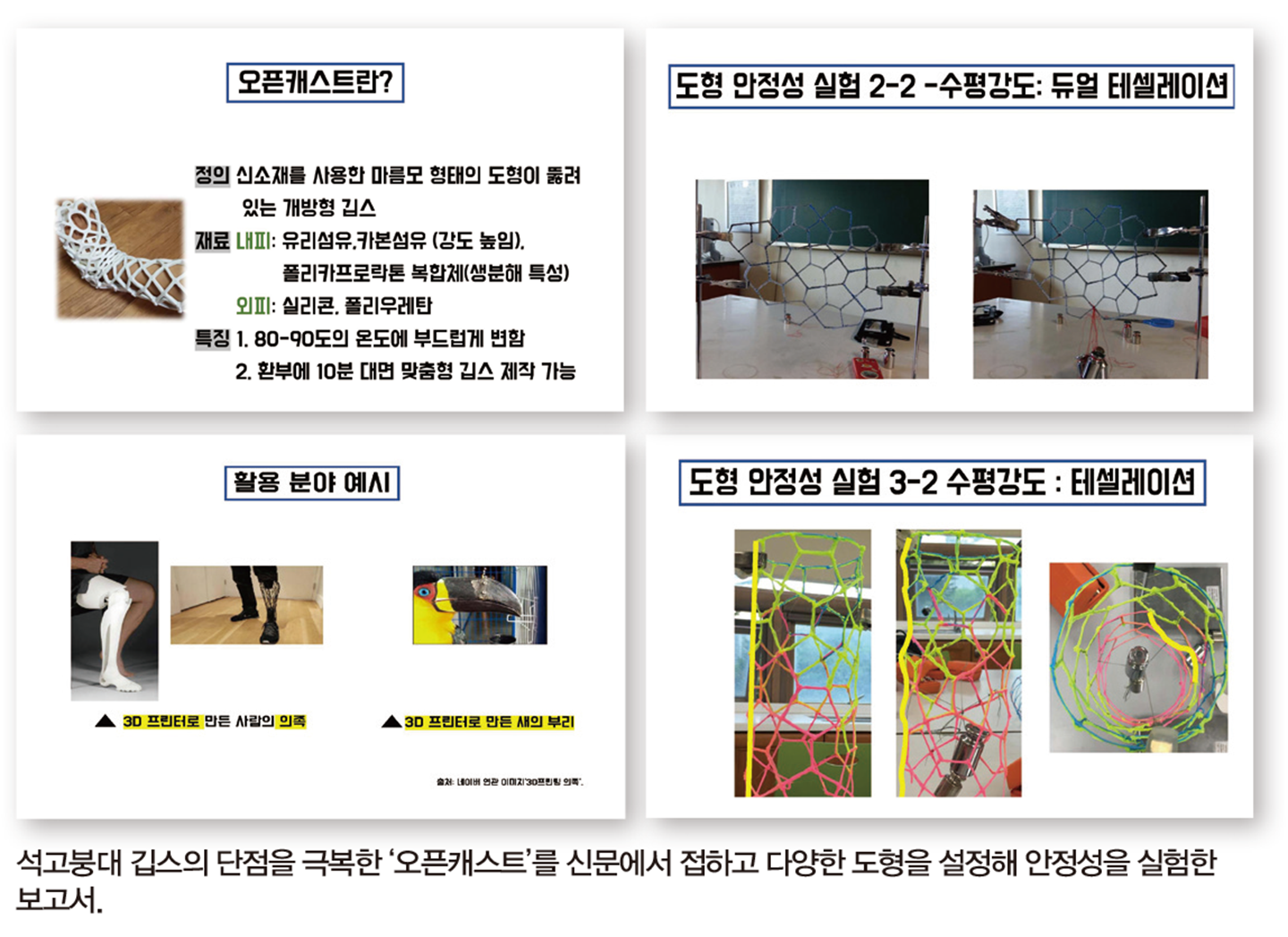 과학도로서 갖춰야 할 탐구 역량을 키우는 계기가 된 또 다른 경험은 ‘오픈캐스트’를 주제로 참여한 ‘융합영재산출물대회’였다. 생활에 많은 제약이 따르는 석고붕대 깁스를 대체할 그물형 캐스트로 배 등 과일에 쓰이는 포장재를 생각하면 쉽다.
