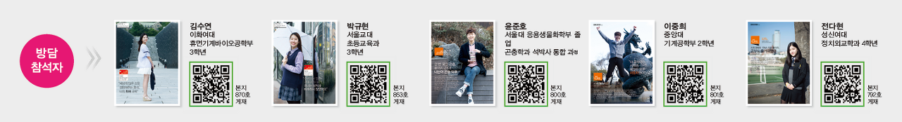 <내일교육>의 발자취와 함께 한 대표적인 연재 기사를 꼽는다면 ‘수시 합격생 릴레이 인터뷰’를 빼놓을 수 없습니다. 해마다 학생부 종합 전형으로 합격한 30여 명의 대학생들을 만나면서 입시를 넘어선 고등학교 교육의 현재와 가야 할 방향, 대학과 전공을 바라보는 시선까지 우리 교육을 둘러싼 여러 화두를 안고 돌아왔었죠. 창간 20주년 특별 기획을 준비하면서 자연스럽게 이 친구들을 다시 만나봐야겠다고 생각했습니다. 대학 이후의 시간들을 어떻게 펼쳐가고 있는지 무척 궁금했거든요. 놀라웠습니다. 나름의 시행착오와 방황의 시간들도 있었지만, 처음 만났을 때의 그 결대로 성장한 모습이 반가웠지요. 처음 접하는 독자들을 위해 푸릇했던 1학년 시절 인터뷰 기사를 큐알코드로 함께 담았습니다. 비교해 읽어보신다면 왜 이 친구들을 다시 만나고 싶었는지, 짐작할 수 있을 거라 믿습니다. 반가운 얼굴들, 만나보실까요?
