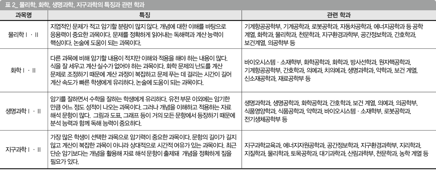 학과별로 응시해야 하는 과목이 다른데, 예를 들어 물리학과 합격생은 <물리학>을, 식품유통공학과 합격생은 <생명과학><미적분><화학>을, 융합생명공학과는 <생명과학><화학> 시험을 응시하는 형태다. 즉, 전공과 연계된 과탐 과목을 선택해 역량을 갖추는 것이 중요하다(표 2).