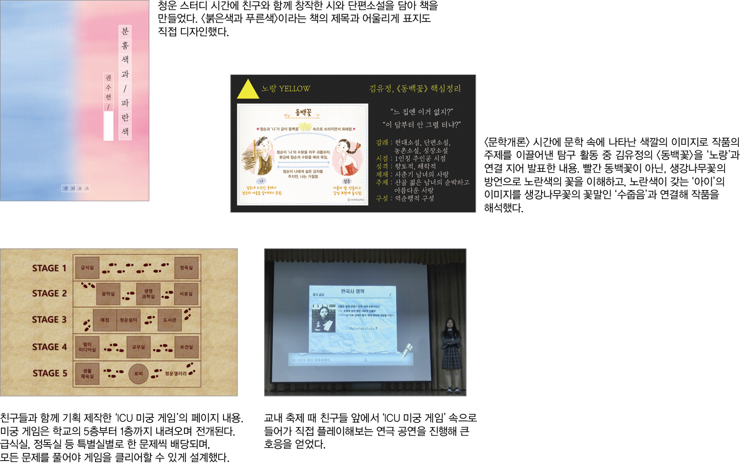 “혹여 잘못된 정보를 알려줄까 봐 걱정돼 더 책임감을 갖고 철저히 공부했던 것 같아요. 정극인의 <상춘곡>을 수업하면서 후배들이 ‘지다’와 ‘디다’, ‘좋다’와 ‘다’ 등의 어휘를 헷갈려 하는 것을 보고 비슷한 어휘들을 표로 정리해 나눠준 기억이 납니다. 쉬는 시간에 문법 질문을 하러 후배들이 찾아올 땐 무척 기뻤어요.” 수현씨는 가장 인상 깊은 교내 활동으로 문학 작품에서 색깔이 갖는 상징성에 대해 탐구한 활동을 꼽았다. <문학개론> 시간에 ‘색깔로 세상을 보다’라는 주제로, 작품을 색깔의 관점에서 해석하고 작가의 의도를 추론한 탐구였다.