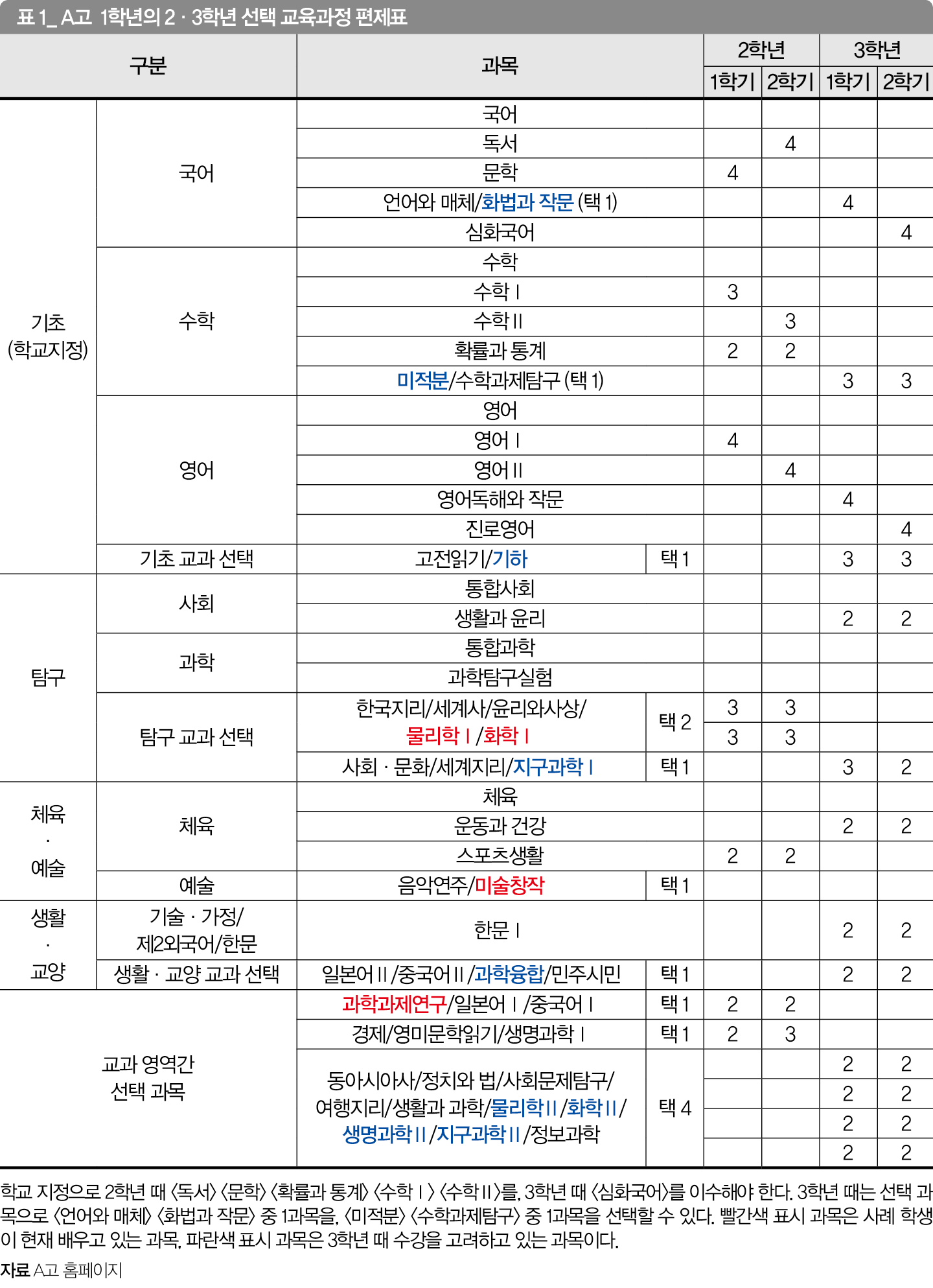 과학중점학급 학생은 3년 간 과학·수학 교과에서 총 교과 이수 단위의 45% 이상을 이수해야 한다. 과학은 8과목(물리학·화학·생명과학·지구과학 Ⅰ,Ⅱ), 수학은 4과목(수학Ⅰ·Ⅱ, 미적분, 확률과 통계, 기하 등) 이수가 필수다(표 3).