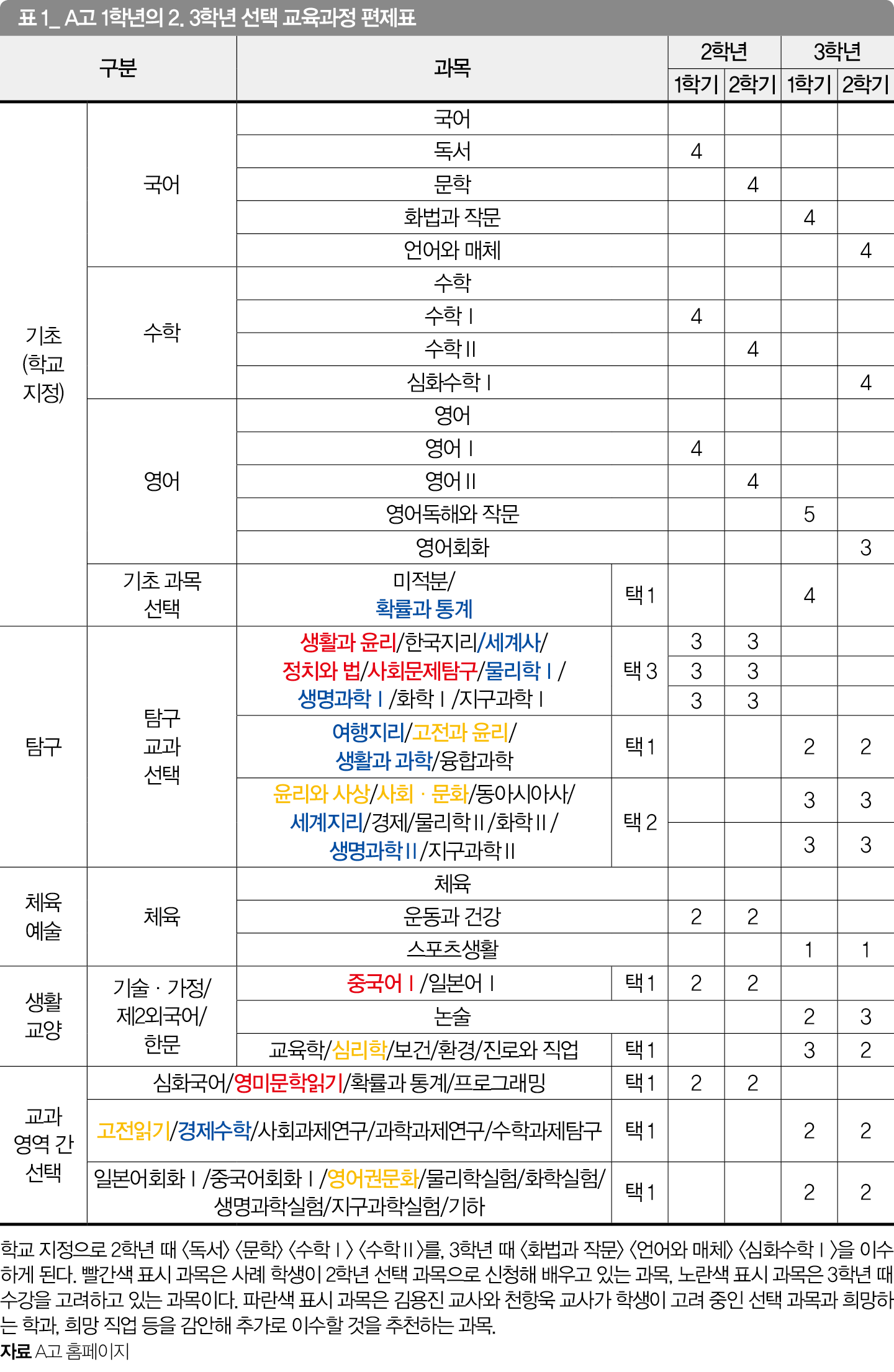 경기 지역 일반고인 A고의 교육과정은 대체로 학생의 선택권이 제한적인 편이다. 서울 동대부여고 김용진 교사는 “학교마다 선택 과목 편성에 차이가 있기 때문에 현재 학교가 제시한 과목 안에서 최대한 본인의 진로에 도움되는 과목을 정확히 판단해 적극적으로 수강하는 것이 답”이라고 전했다.