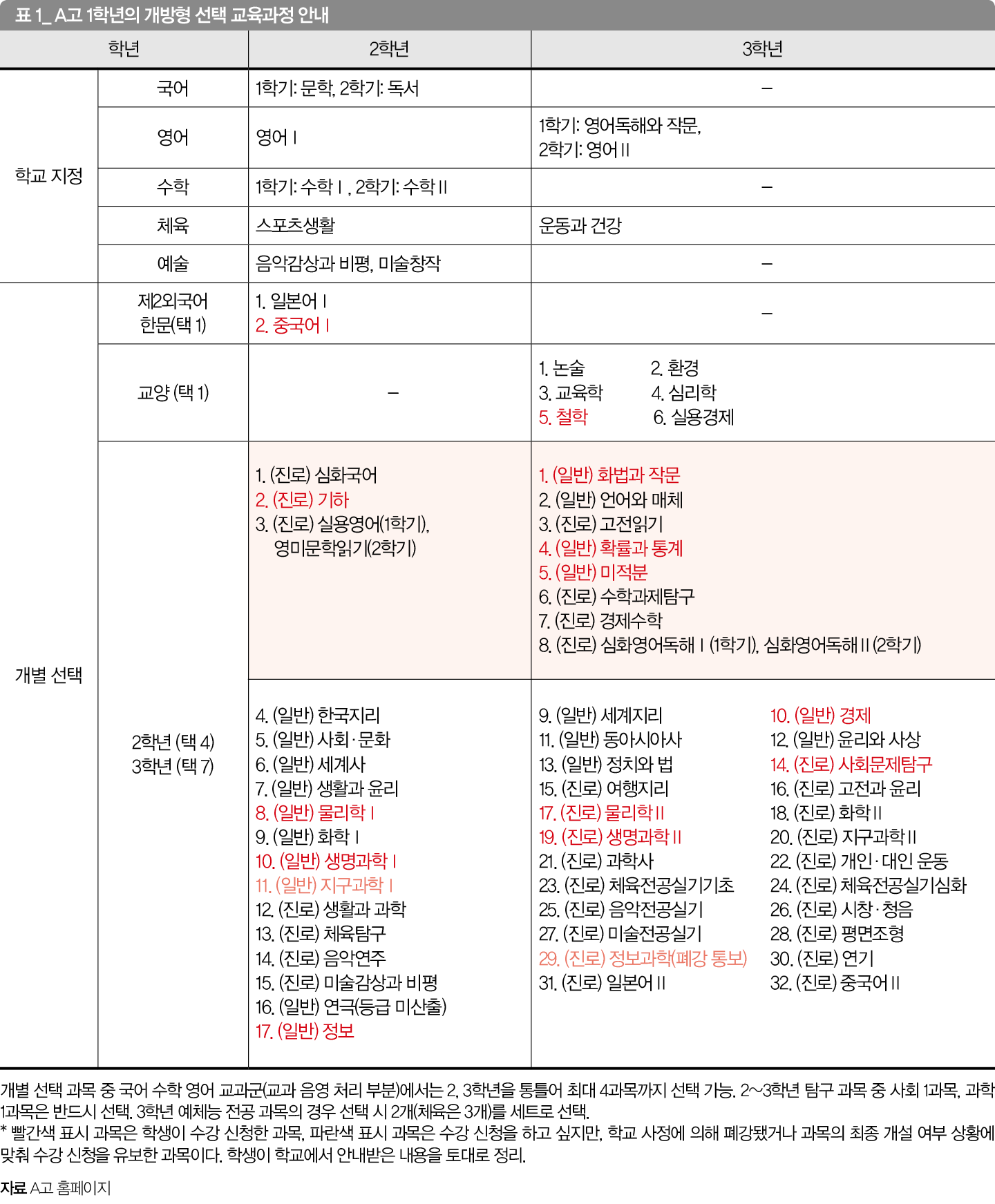 서울 지역의 일반고인 A고는 2, 3학년에 걸쳐 국어 영어 수학 체육 예술 교과에서 11개 과목을 학교 지정 과목으로 정했다.