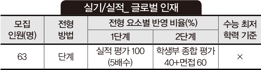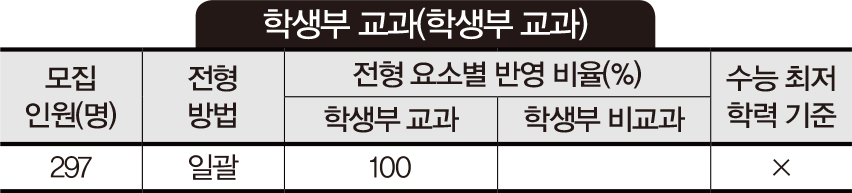 학생부 외 제출 서류가 없고, 재학생과 재수생만 지원할 수 있다. 또한 특성화고, 마이스터고, 예고, 체고, 방송통신고 등 학생부 성적 체계가 다른 고교의 학생은 지원할 수 없다. 학생부 교과 성적 100%로 선발하며, 인문 계열은 국어, 영어, 수학, 사회 교과에 속한 전 과목을, 자연 계열은 국어, 영어, 수학, 과학 교과에 속한 전 과목을 반영한다. 학년별 반영 비율 구분이 없으며, 재학생과 재수생 모두 3학년 1학기까지의 성적만 반영한다. 1등급은 100점, 2등급은 96점, 3등급은 89점으로 타 대학보다 등급 급간별 점수가 큰 편이라 내신 성적이 매우 좋은 학생들만 지원하고 합격할 것으로 예상한다.