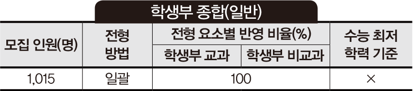 삼수생까지 지원할 수 있지만 검정고시 출신자, 국외 고교 졸업자 등 학생부가 없는 학생은 지원할 수 없다. 학생부를 바탕으로 학생부 종합 평가 100%로 선발한다. 학생부 주요 평가 영역은 수상 경력, 창의적 체험 활동, 세부 능력 및 특기 사항, 행동 특성 및 종합 의견이다. 학생부에 기재된 내용을 중심으로 고교 교육과정의 충실한 이수, 종합 성취도, 4대 핵심 역량에 대한 종합적인 평가가 이루어진다. 종합 성취도는 단순하게 교과 성적을 정량적으로 수치화하여 반영하는 것이 아니라, 학생부에 드러난 학업 관련 기록을 통해 종합적인 성취를 정성 평가한다.