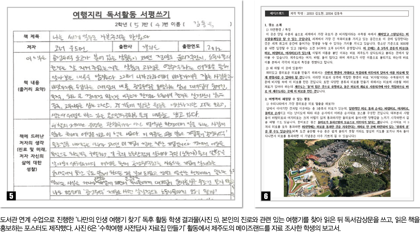 2019년에는 도서관 연계 수업인 ‘나만의 인생 여행기 찾기’ 활동을 비롯해 ‘수학여행 사전답사 자료집 만들기’ ‘학급별 체험학습 기획안 공모전’ 등의 수행평가를 진행했다. ‘수학여행 사전답사 자료집 만들기’는 학생들이 학교에서 체험하는 여행을 <여행지리> 교과와 연계해보고자 기획한 수업이다. 수학여행 때 방문할 11곳의 장소를 6개 학급에서 조별로 나눠 맡은 뒤 보고서를 작성했다. 나중에 우수 보고서를 추려 실제 수학여행 자료집으로 제작했는데, 보고서를 작성한 학생들의 이름도 수록했다.