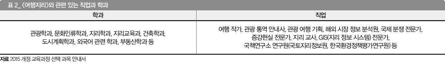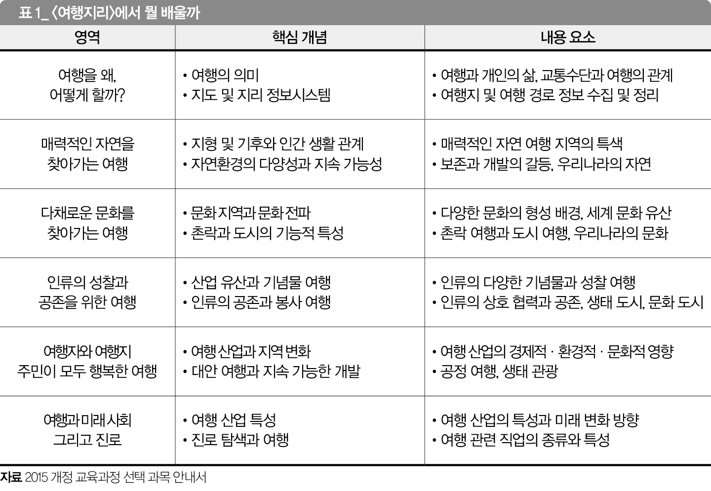 <여행지리> 수업은 지역과 여행에 관한 정보 수집·정리 방법과 함께 삶을 풍요롭게 하는 미래 여행 계획을 세우는 데 도움을 준다. 관광학이나 지리학뿐 아니라 문화인류학, 외교학, 도시 계획학, 건축학, 지역학 연구 등의 학문을 이해하는 바탕이 되기도 한다. 6개의 단원 안에서 여행의 의미, 지형·기후와 인간 생활 관계, 여행 산업의 지역 변화, 여행 관련 직업에 이르기까지 다채로운 내용을 배운다(표 1·2).