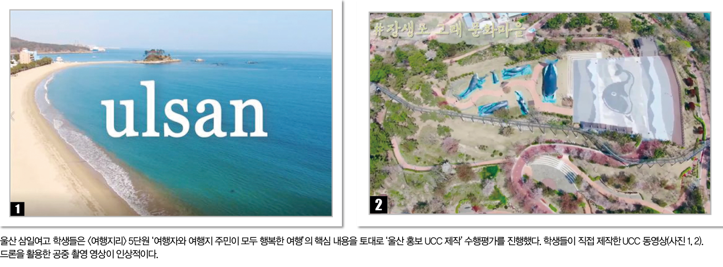 울산 홍보 UCC 제작을 위한 비주얼싱킹과 창의적인 스토리텔링, 스톱모션을 이용한 UCC 제작, UCC 편집과 발표 등 크게 3가지 요소 안에서 평가를 진행했다. 요소별 점수는 5~3점까지, 항목별 합계 만점은 15점, 최저점은 9점으로 정했다. 학생들은 <여행지리>라는 과목 안에서 V-LOG, 드로잉, 드론 등을 접할 수 있을 뿐 아니라 동영상 편집 프로그램을 활용하는 경험도 할 수 있다. 그래서인지 미디어 계열을 진로 희망하는 학생들도 많이 신청한다. 2019년에는 학생들이 만든 영상이 ‘울산 홍보 UCC’ 공모전에서 대상을 수상하기도 했다.