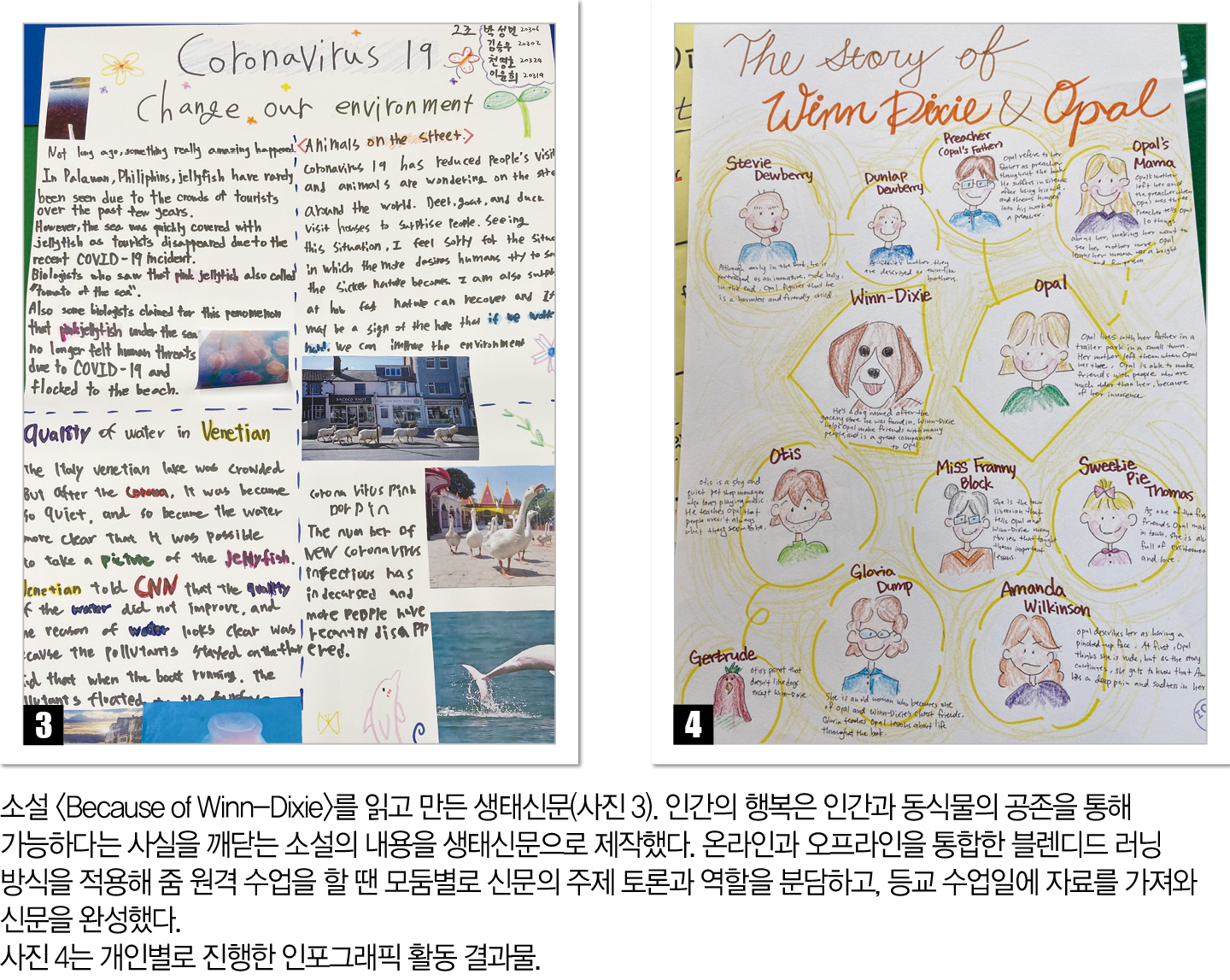 수행평가는 프로젝트 수업으로 인간과 동물의 생존을 인식하기 위한 생태신문 제작과 <Because of Winn-Dixie>의 내용을 인포그래픽으로 제작해 홍보하는 활동에 무게를 뒀다. 에세이 쓰기, 생태신문 프로젝트, 인포그래픽 제작 안에서 조건과 내용, 형식 요소 충족 여부를 평가 기준으로 삼았다. 에세이 쓰기 주제는 My Pet, My Phobia, My Party Planner 등으로 제시했고, 생태신문은 모둠, 인포그래픽 제작은 개인 활동이었다. 이와 함께 게임 기반 학습용 플랫폼인 카훗(kahoot)을 통해 즐거운 복습 시간을 가졌다.
