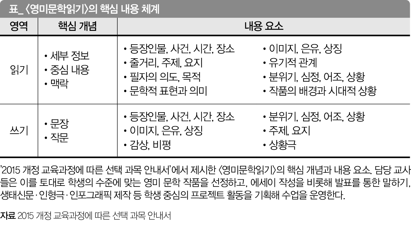 ‘2015 개정 교육과정에 따른 선택 과목 안내서’에 따르면 <영미문학읽기>는 ‘영미에서 출판된 대표적인 소설, 시, 희곡 등 문학 작품의 독서와 감상을 통해 영어 이해 능력과 표현 능력을 심화하고 인문학적 상상력과 창의력을 바탕으로 한 영어 독서 능력을 높이는 과목’이다. <영어권문화> <실용영어> <진로영어>와 함께 영어 교과의 진로선택 과목에 속한다. 수능과 관계없는 과목으로 주로 2, 3학년에 편성하다 보니, 학생들의 학업 부담을 최대한 줄이고 영어에 흥미를 되찾는 방향으로 수업을 운영한다. 교과서가 없어 교사가 교재를 정하고 수업을 이끌어야 하는 만큼 교사의 역량에 따라 수업 내용도 차이가 크다. 과목 취지에 맞게 실질적인 수업을 운영하는 일반고를 발굴해 수행평가 내용과 학생들의 과목 이수 소감을 들었다.