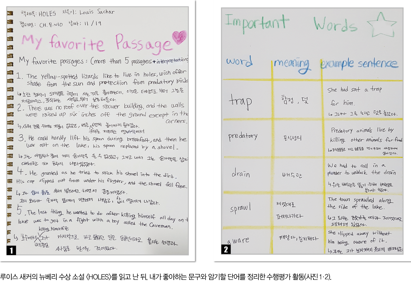 2학기 수업에서 다룬 뉴베리 수상작 <HOLES>는 주로 쉬운 어휘로 구성돼 있지만, 깊이 있는 묘사를 다룬 문장이 많아 지도서로 적합하다. 원서를 읽은 뒤, 좋아하는 문구나 암기할 단어를 뽑아 정리하고 다양한 인물관계를 지도로 표현하는 활동을 했다. 각 인물이 처한 어려움을 해결하는 과정을 보며 학생들이 느낀 점을 토론하는 시간도 가졌다. 대면 수업이 가능했다면 각 인물의 특징을 살린 마스크를 만들어 쓰고 각자 대사를 외워 연극 공연을 했을 텐데, 진행하지 못해 아쉽다.