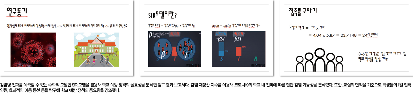 “주제 선정은 3월 마지막 주에, 논문 요약은 4월 둘째 주에, 탐구 결과 발표는 6월에 진행해 항목별로 평가를 진행했다. 주제 탐구 보고서 준비를 한 학기 내내 한 셈이다. 논문 요약을 수행평가 항목에 넣은 이유는 관심 있는 키워드로 논문을 검색하고, 다른 사람의 논문을 읽어보는 것은 주제를 구체화하거나 확장해나가는 데 큰 도움이 되기 때문이다. 또한 논문의 주제, 서론, 연구 문제 및 방법, 연구 결과 및 해석, 결론을 요약하는 과정을 통해 보고서 작성 방법도 깨닫게 된다. 2020년 당시 코로나19 이슈가 워낙 크다 보니 관련 탐구 주제가 많았고, 단순히 자료 조사가 아닌 수학적 모델링을 활용해 결과를 도출해낸 학생들의 수행평가도 눈에 띄었다.”