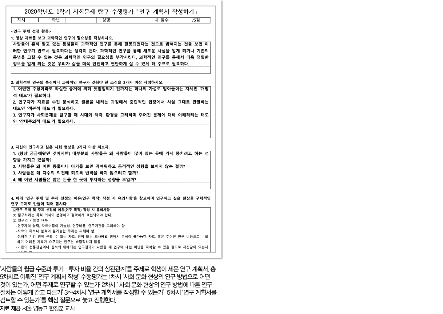 “우리 학교는 2020년 <사회문제탐구> 수업이 3학년에 편성돼 있어 지나친 활동 중심의 수행평가보다는 자료 수집과 분석을 기반으로 한 ‘연구 계획서’ 작성에 초점을 맞췄다. 우리 사회의 다양한 계층에서 발생하는 사회 문제를 깊이 탐구하고 원인을 파악해 해결 방안까지 모색하는 <사회문제탐구> 과목의 취지를 살렸다. 그 안에서 학생들이 나만의 스토리를 만들 수 있도록 교과서 ‘사회 문제의 이해’ 단원에서 5차시에 걸쳐 수행평가를 진행했다. 학생들은 사회 문제와 관련된 다양한 정보와 자료를 수집·분석하고, 이를 적용해 해결 방안을 모색하는 과정에서 정보 활용 능력, 문제 해결 능력, 의사 결정 능력, 비판적 사고력 등을 기를 수 있다. 보고서 작성과 발표를 통해 의사소통 능력과 반성적 글쓰기 능력을 키우는 데도 도움이 된다.”
