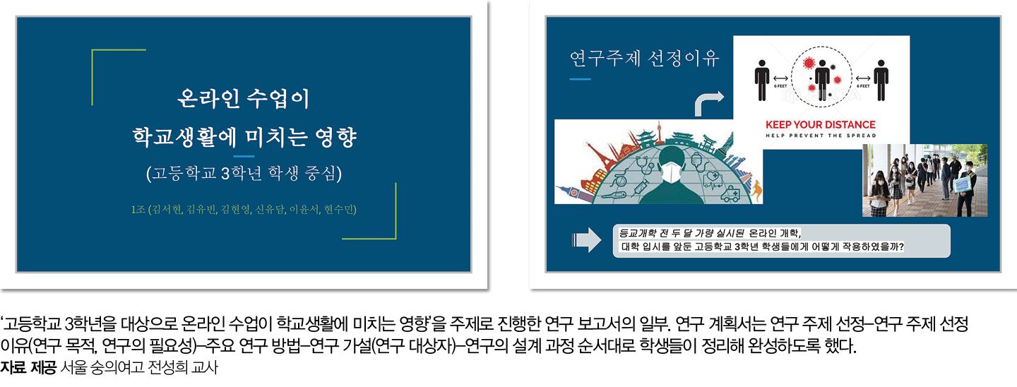 “우리 학교는 2020년 <사회문제탐구> 수업이 3학년에 편성돼 있어 지나친 활동 중심의 수행평가보다는 자료 수집과 분석을 기반으로 한 ‘연구 계획서’ 작성에 초점을 맞췄다. 우리 사회의 다양한 계층에서 발생하는 사회 문제를 깊이 탐구하고 원인을 파악해 해결 방안까지 모색하는 <사회문제탐구> 과목의 취지를 살렸다. 그 안에서 학생들이 나만의 스토리를 만들 수 있도록 교과서 ‘사회 문제의 이해’ 단원에서 5차시에 걸쳐 수행평가를 진행했다. 학생들은 사회 문제와 관련된 다양한 정보와 자료를 수집·분석하고, 이를 적용해 해결 방안을 모색하는 과정에서 정보 활용 능력, 문제 해결 능력, 의사 결정 능력, 비판적 사고력 등을 기를 수 있다. 보고서 작성과 발표를 통해 의사소통 능력과 반성적 글쓰기 능력을 키우는 데도 도움이 된다.”