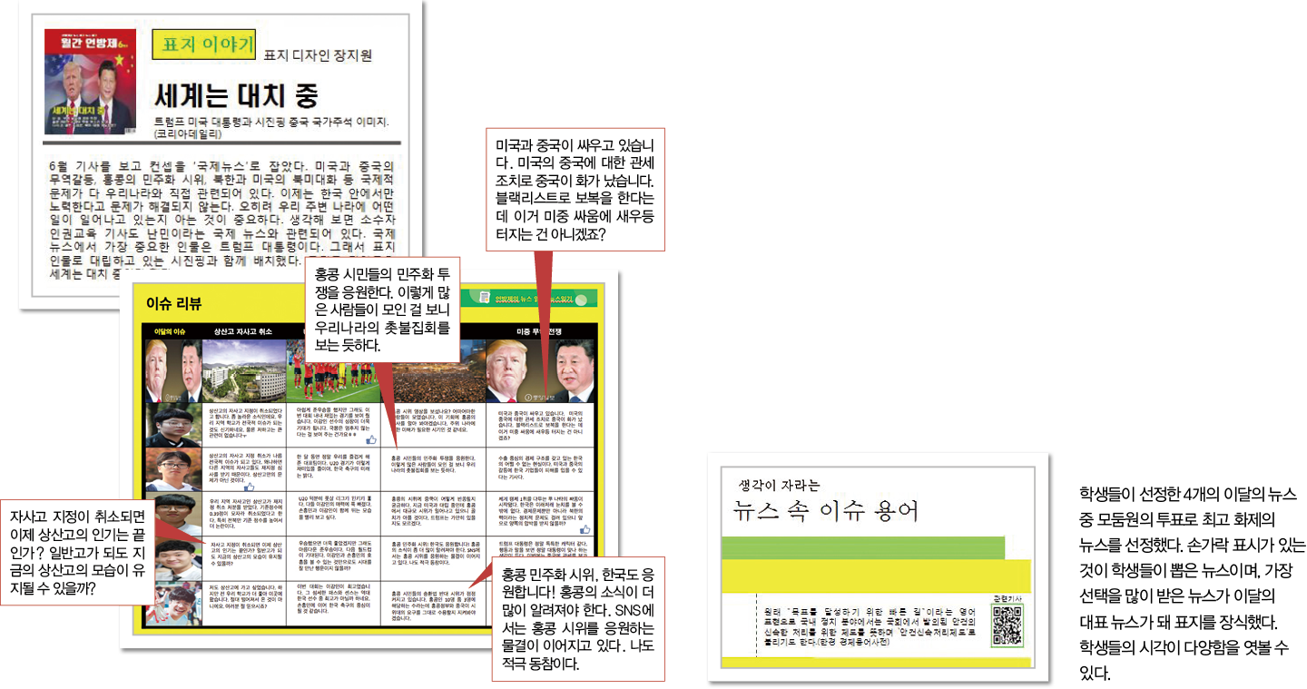 매달 학생들이 화제의 이슈를 선정하고 모둠별로 가장 공감되는 이슈를 정해 잡지 표지와 내지를 구성했다. 실제 잡지 표지처럼 사진과 제목을 배치하고, 그달의 잡지 콘셉트를 설명하는 표지 이야기를 싣는 등 매체를 활용하고 제작하는 시간을 가졌다. 또한 학생들이 뉴스에서 뽑은 이슈 용어를 설명하고 관련 기사를 QR코드로 표기해 편하게 읽을 수 있는 페이지도 마련했다. 수행평가를 통해 학생들이 같은 뉴스도 바라보는 시각이 다를 수 있다는 것을 배우고, 해결 방안을 고민하는 등 현대 사회에서의 매체의 영향력, 매체 언어의 가치를 이해해나갔다.
