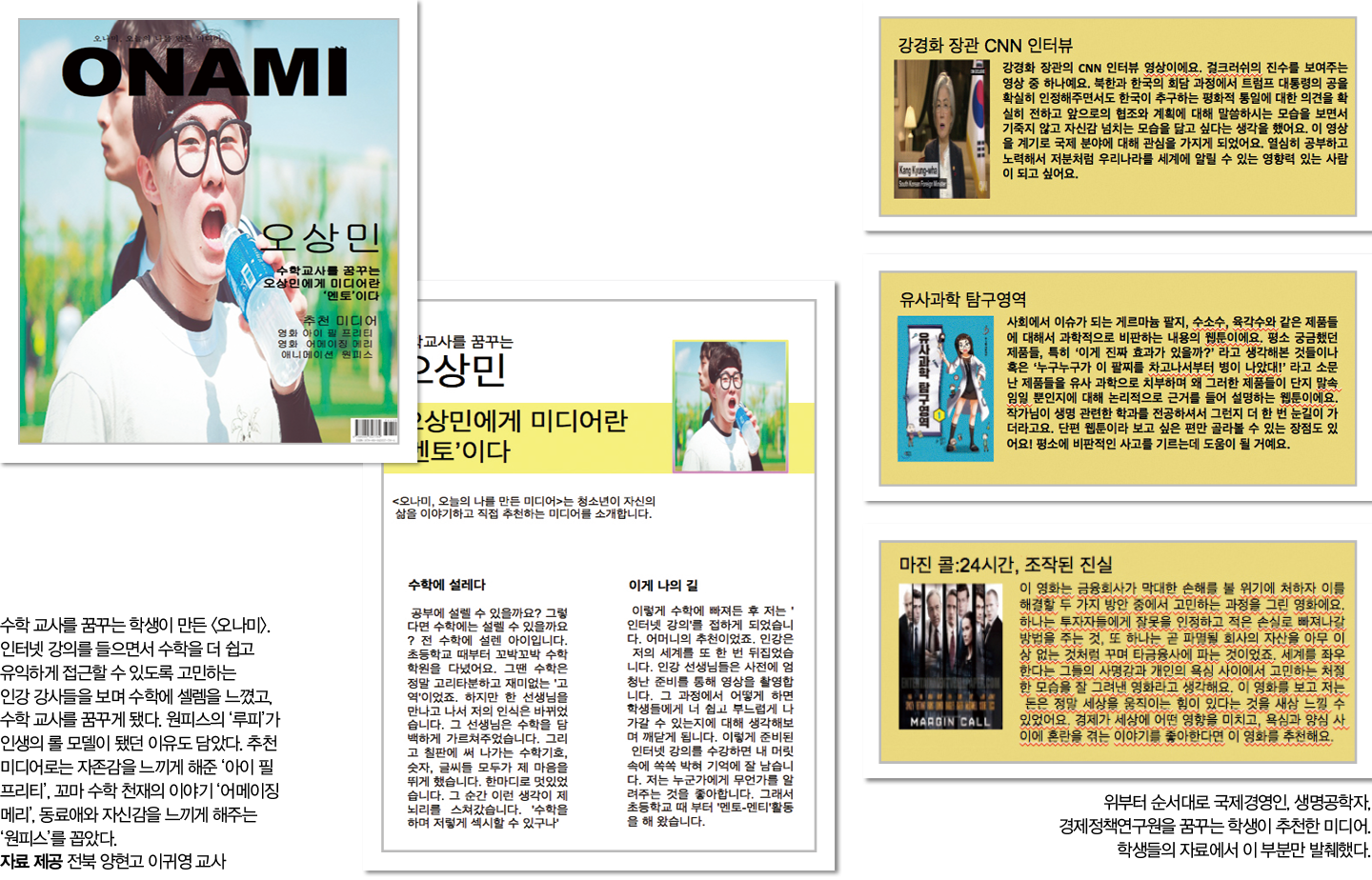 <오나미>는 오늘의 나를 만든 미디어라는 뜻으로, 학생들과 고민 끝에 붙인 이름이다. 오나미는 자신의 삶을 이야기하고 공유하고픈 미디어를 소개하는 자서전 형태의 잡지다. 수행평가를 통해 학생들은 자신의 모습을 성찰하고, 어떤 사람으로 성장하고 싶은지 고민하는 시간을 가졌다. <오나미>를 만들고 발표하는 시간을 통해 친구들의 생각, 진로를 공유했고, 미디어 추천을 통해 매체 활용의 폭도 넓혀나갔다. 학생들의 진로에 따라 추천하는 미디어의 종류나 성격이 다른 것도 인상적이었다. ‘미디어란 세상을 보는 눈이다’ ‘미디어란 나를 찾는 새로운 길이다’ ‘미디어란 랜덤박스다’ ‘미디어란 동기다’ ‘미디어란 방향 지시등이다’ 등 학생들이 정의한 미디어의 의미를 통해 현대 사회에서 매체, 미디어의 영향, 활용 능력이 얼마나 중요한지 엿볼 수 있었다.