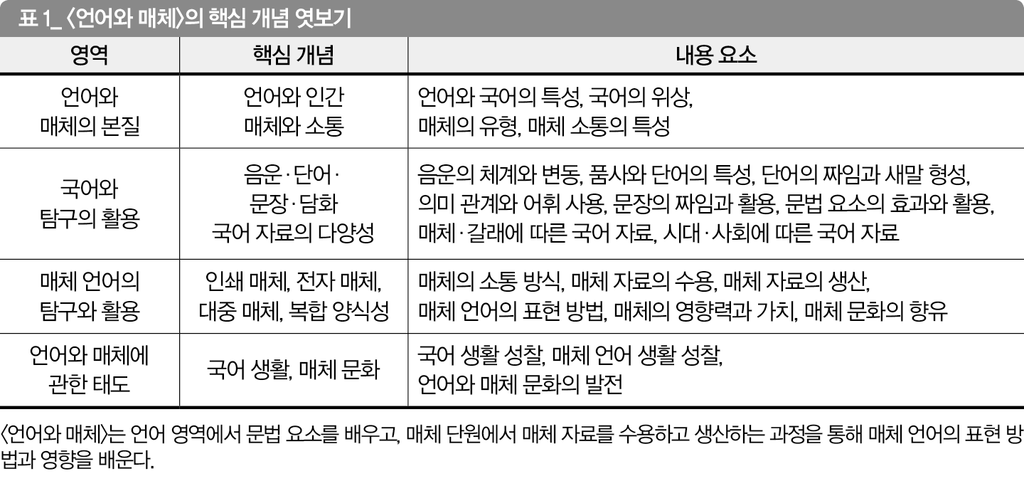 <언어와 매체>는 음성 언어, 문자 언어, 매체 언어를 통해 언어의 본질을 배우고, 의사소통에 활용하는 역량을 배우는 과목이다(표 1).