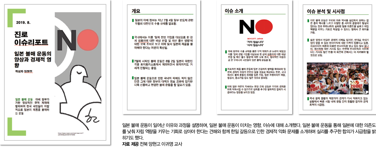 같은 기간이지만 학생들이 선정한 이슈는 다양했다. 2019년 8월 학생들이 선정한 주제는 ‘새벽 배송의 편리함과 이면의 문제점’ ‘홍콩 범죄인 인도법 반대 시위’ ‘초등 교과서 한자어 병기’ ‘디지털 혁명과 출판의 미래’ ‘일본 불매 운동의 양상과 경제적 영향’ ‘CSV 공유 가치 창출’ ‘자사고 폐지’ 등 다양했다. 매체를 활용해 학생들은 사회 현상이나 진로에 대한 관심을 확장했고, 한 주제와 관련한 여러 매체의 시각을 비판적으로 사고했다. 국어 교육의 목적인 비판적·논리적 사고를 향상하는 데 도움이 되는 시간이었다.