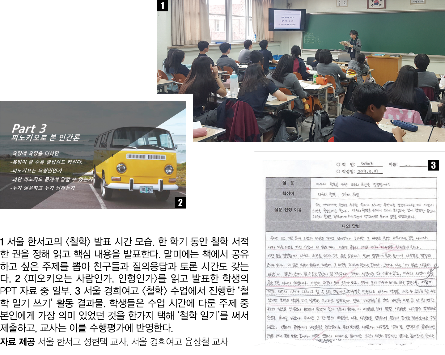 서울 경희여고 윤상철 교사는 “고등학교에서 배우는 <철학>은 지식을 접하고 암기하기보다는 학생 스스로 철학하는 힘을 기르게 하는 과목이다. ‘왜, 무엇을, 어떻게’라는 질문을 이어가며 자기 정체성을 확립하고, 민주사회 시민으로서 다른 사람과 더불어 살 수 있는 능력을 갖추는 데 필요하다”고 설명했다.