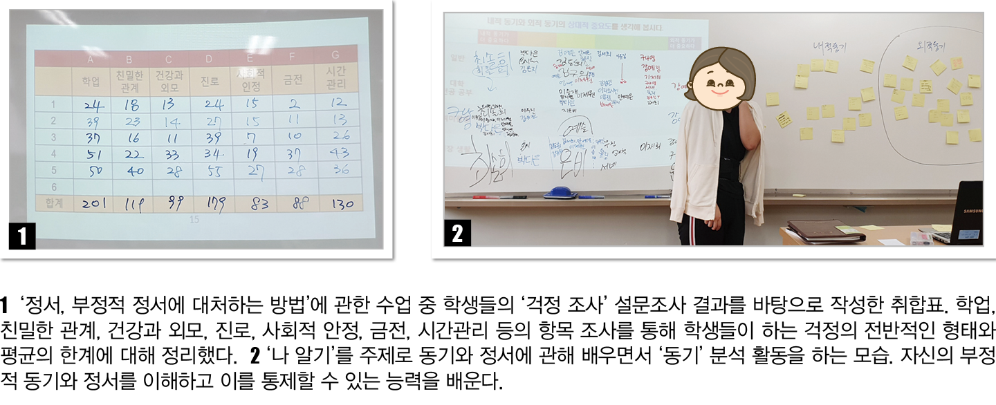 또 청소년기에 겪는 부정적 정서를 어떻게 대처할 것인지에 관해 학급별로 ‘걱정 설문조사’를 하고 그 데이터를 분석하는 ‘부정적 정서에의 대처’ 수업까지 다채롭다. <심리학>은 교양 과목이기 때문에 석차나 등급 산출 없이 Pass/Fail로만 평가한다.