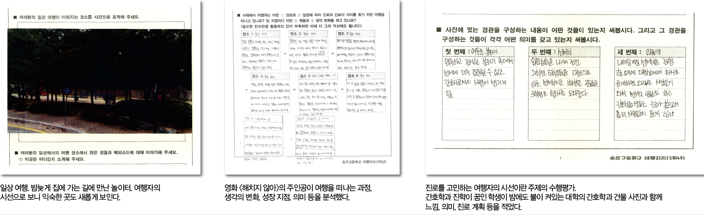 최 교사는 “책이나 대중매체를 골라 여행을 떠나는 이유 찾기, 여행자의 시각으로 일상공간 바라보기, 자신의 진로와 관련된 장소와 이미지 설명하기 등의 수행평가를 했다. 특히 여행자의 시각으로 일상생활 공간을 바라보며 학생들은 지금껏 느껴보지 못한 새로움을 느꼈던 것 같다”고 전했다.