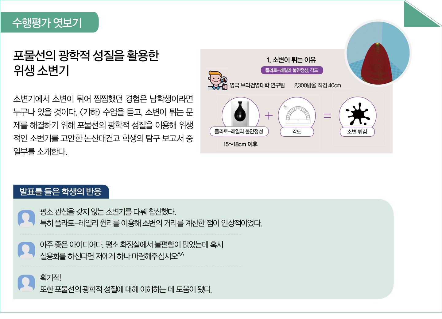 박 교사는 “자동차의 전조등, 접시 모양의 위성 중계 안테나인 파라볼라 안테나, 치과에서 사용하는 의료용 헤드라이트, 요로결석 파쇄기, 첨성대 몸통 각단의 원곡선 등 학생들이 찾은 사례는 다양했다. 특히 타원의 광학적 성질을 이용한 요로결석 파쇄기의 예는 신선했다”고 전했다.