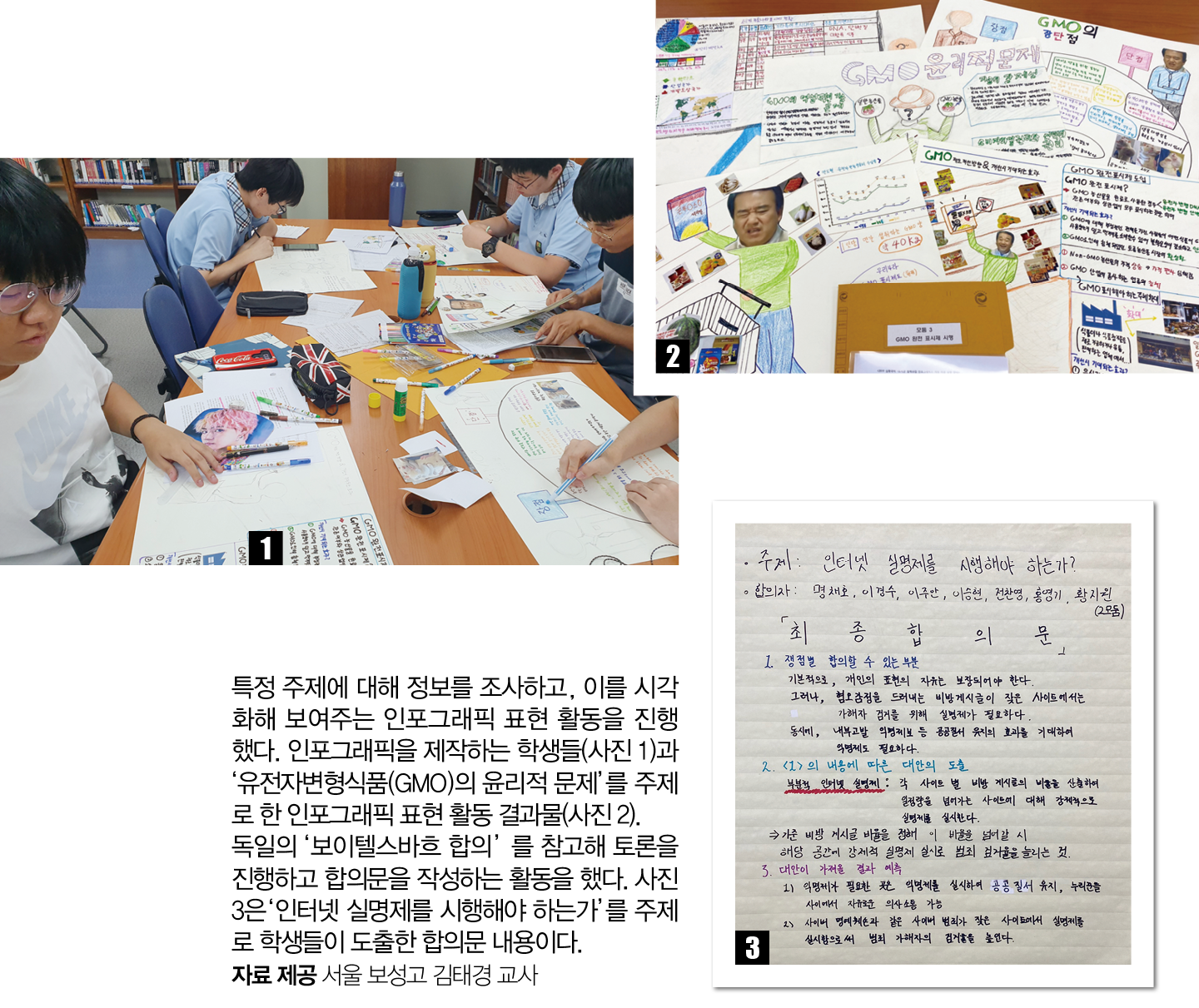 김태경 교사는 “그동안 책, 논문, 통계, 신문기사 등 다양한 콘텐츠를 활용해 필요한 정보를 추출하고 이에 근거한 수업 활동을 다채롭게 진행했다. 2019년 1학기에는 학생들이 특정 주제에 대해 조사한 정보를 시각화해 보여주는 인포그래픽 표현 활동을, 2학기에는 민주 시민 교육의 일환으로 독일의 ‘보이텔스바흐 합의(1976년 서독의 보수 및 진보 정치교육학자들이 토론 끝에 정립한 교육 지침)’를 참고해 토론하고 합의문을 작성하는 활동을 했다. 작년에는 ‘혐오 표현’을 주제로 독서와 토론, 영상 제작 활동을 진행했다”고 설명했다.