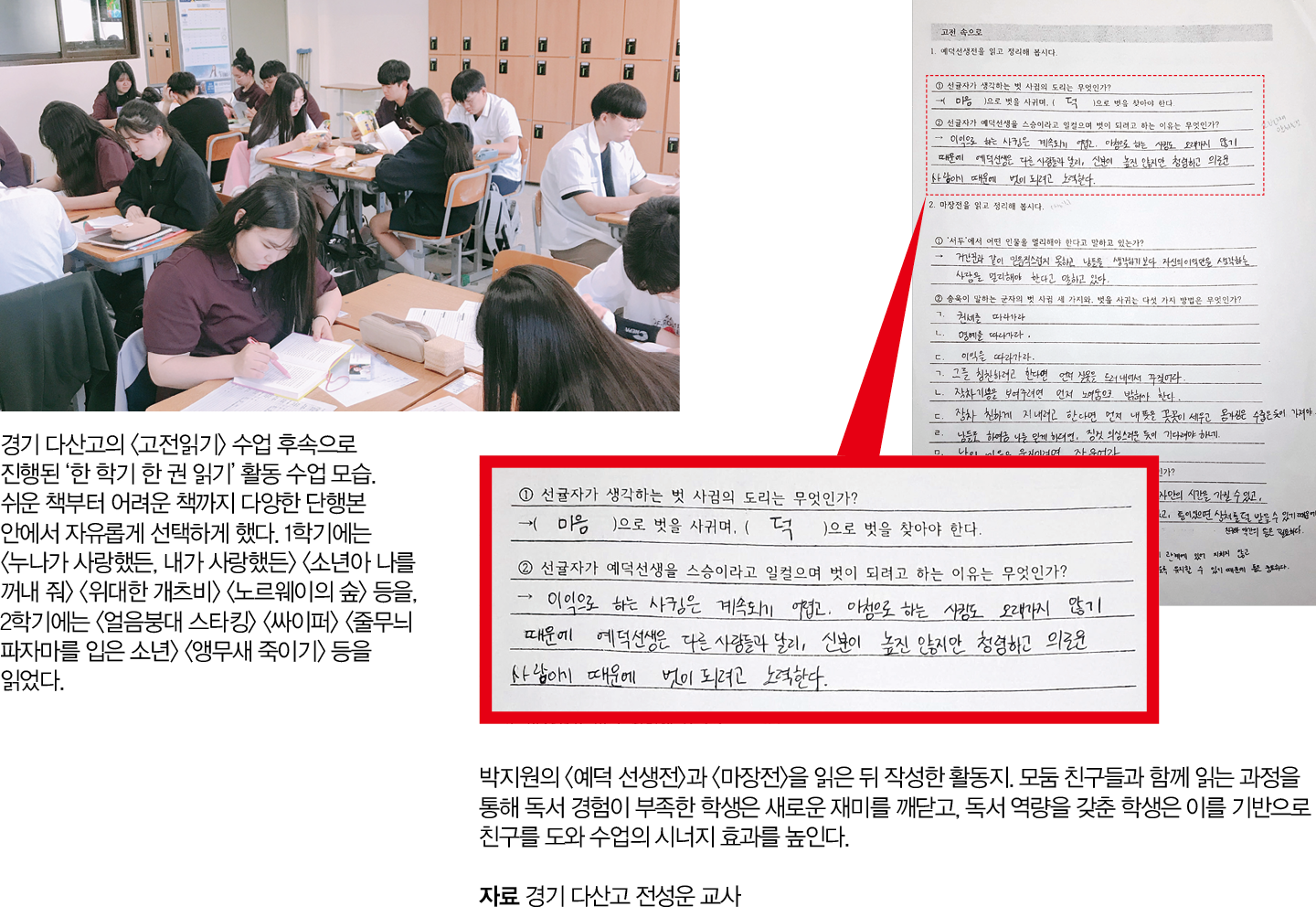 전 교사는 “교사 입장에서도 <고전읽기> 수업은 부담이 아니라 기회다. 전국 국어 교사 모임의 독서 교육 분과인 ‘물꼬방’의 도움으로 수업을 진행할 수 있었는데, 어려울 땐 동료 선생님들과 머리를 맞대는 것도 방법이다. 학생들의 마음속 책장에 책을 꽂아주는 선생님이 더 많아지면 좋겠다”고 덧붙였다.