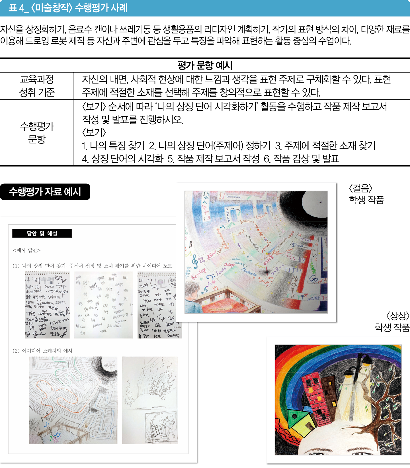 예술 교과의 핵심은 다양한 분야의 지식, 기술, 경험을 연계해 표현하는 것이다. 미술은 느낌과 생각을 시각적으로 표현하고 음악은 소리를 통해 감정이나 생각을 표현해 다른 사람과 소통한다. 또한 예술 교과는 그 시대를 이해하는 데 도움이 된다(표 4).