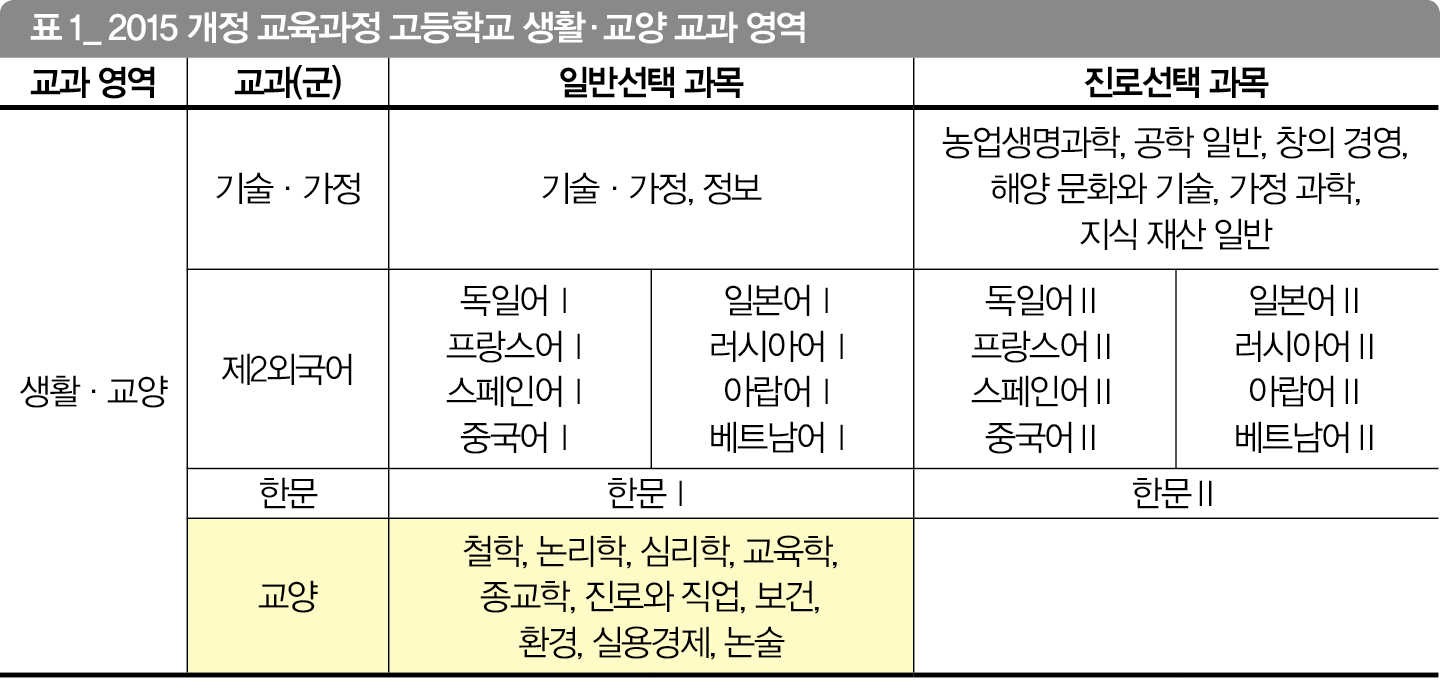 고등학교에서 배우는 교양 교과는 <철학> <논리학> <심리학> <교육학> <종교학> <진로와 직업> <보건> <환경> <실용경제> <논술> 등 10개 과목이다. 이들 과목은 입시와 직접적인 연결고리가 없다는 인식으로 교육과정 안에서 소홀히 대하기 쉽다. 하지만 개인 생활과 사회 생활에 실질적인 도움을 줄 수 있는 실용 학문이라는 측면에서, 또 창의·융합 교육이라는 큰 틀에서 보면 그 의미가 크다.